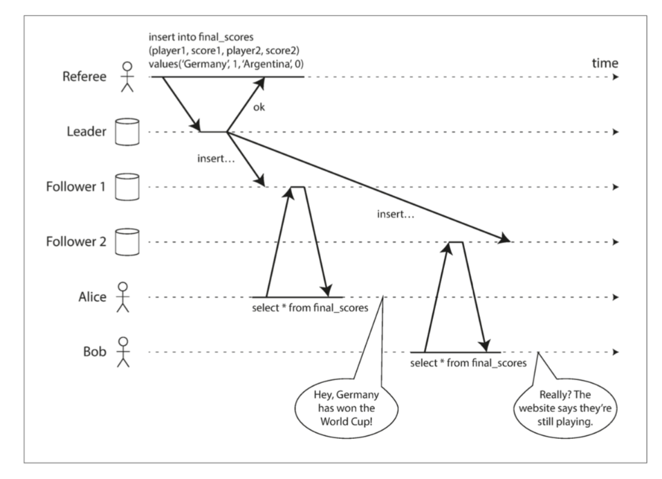 - 例子 (图 9-1): Alice看到世界杯最终比分,告诉Bob。Bob刷新(在Alice看到结果之后),却看到旧的“进行中”状态。这违反了线性一致性,因为Bob的读取发生在一个返回新值的读取(Alice的)之后,却读到了旧值。