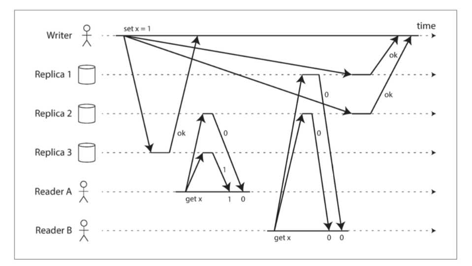 - 即使 W+R>N (严格法定人数) 也可能非线性一致 (图 9-6, 因网络延迟)。