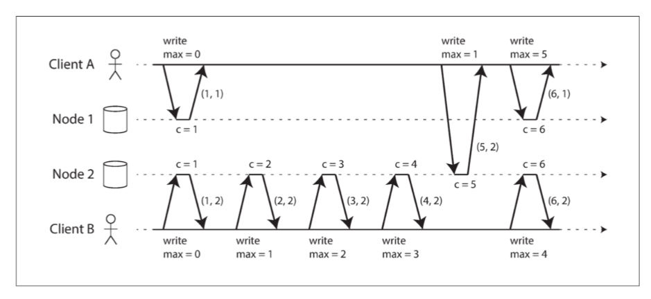图 9-6 非线性一致的执行,尽管使用了严格的法定人数 - LWW(最后写入胜利)基于时钟 -> 非线性一致 (时钟偏斜)。
