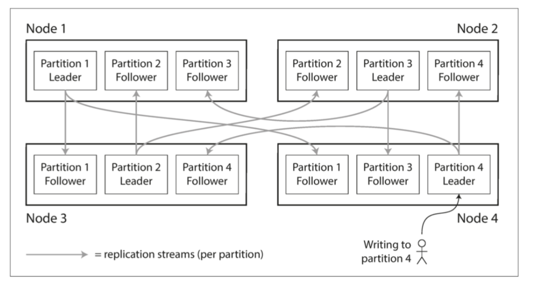 - 一个节点可以同时是某些分区的 领导者 (Leader/Primary) 和其他分区的 追随者 (Follower/Secondary) (如图 6-1)。