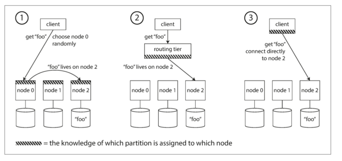 问题: 客户端如何知道应该将请求 (读/写键 “foo”) 发送到哪个节点的哪个分区?尤其在再平衡导致分区-节点映射变化时。