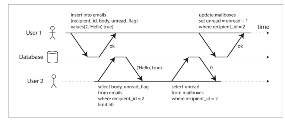 - 文档模型: 更新非规范化数据时,需要原子地修改多个文档(如图 7-2,邮件和未读计数)。