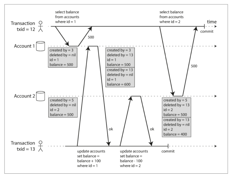 created_by(创建者 txid) 和deleted_by(删除者 txid, 初始为空)。DELETE只是标记deleted_by,由后台垃圾回收清理(当所有活跃事务都不再需要访问旧版本数据时)。UPDATE=DELETE+INSERT(创建新版本)。 (如图 7-7) - 可见性规则: 事务读取时,根据其