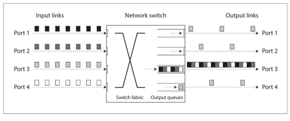 图 8-2 如果有多台机器将网络流量发送到同一目的地,则其交换机队列可能会被填满。在这里,端口 1,2 和 4 都试图发送数据包到端口 3