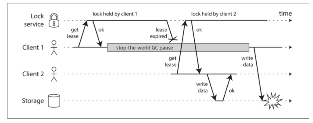 - 例子 (图 8-4 - 错误的锁实现): 客户端持有锁/租约 -> 发生长暂停 -> 租约过期,另一客户端获取锁并写入 -> 原客户端恢复,认为租约仍有效,继续写入 -> 数据损坏。