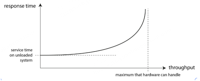 当服务吞吐量接近容量时,响应时间会由于排队而急剧增加