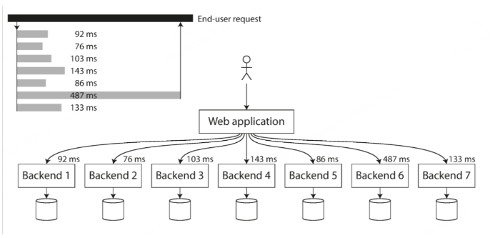 图 2-6. 当一个请求需要多次后端调用时,只需要一个缓慢的后端请求,就能拖慢整个终端用户的请求